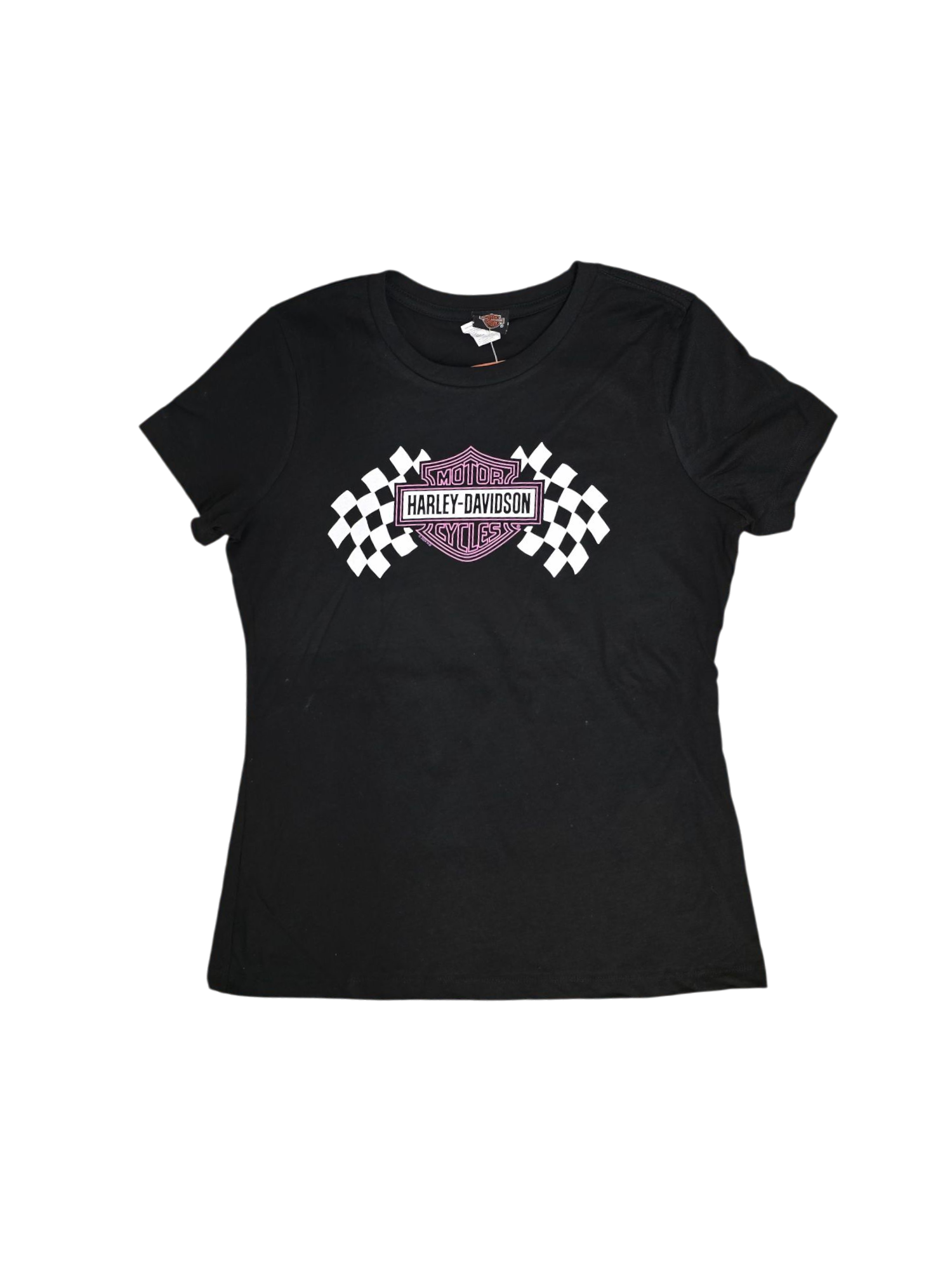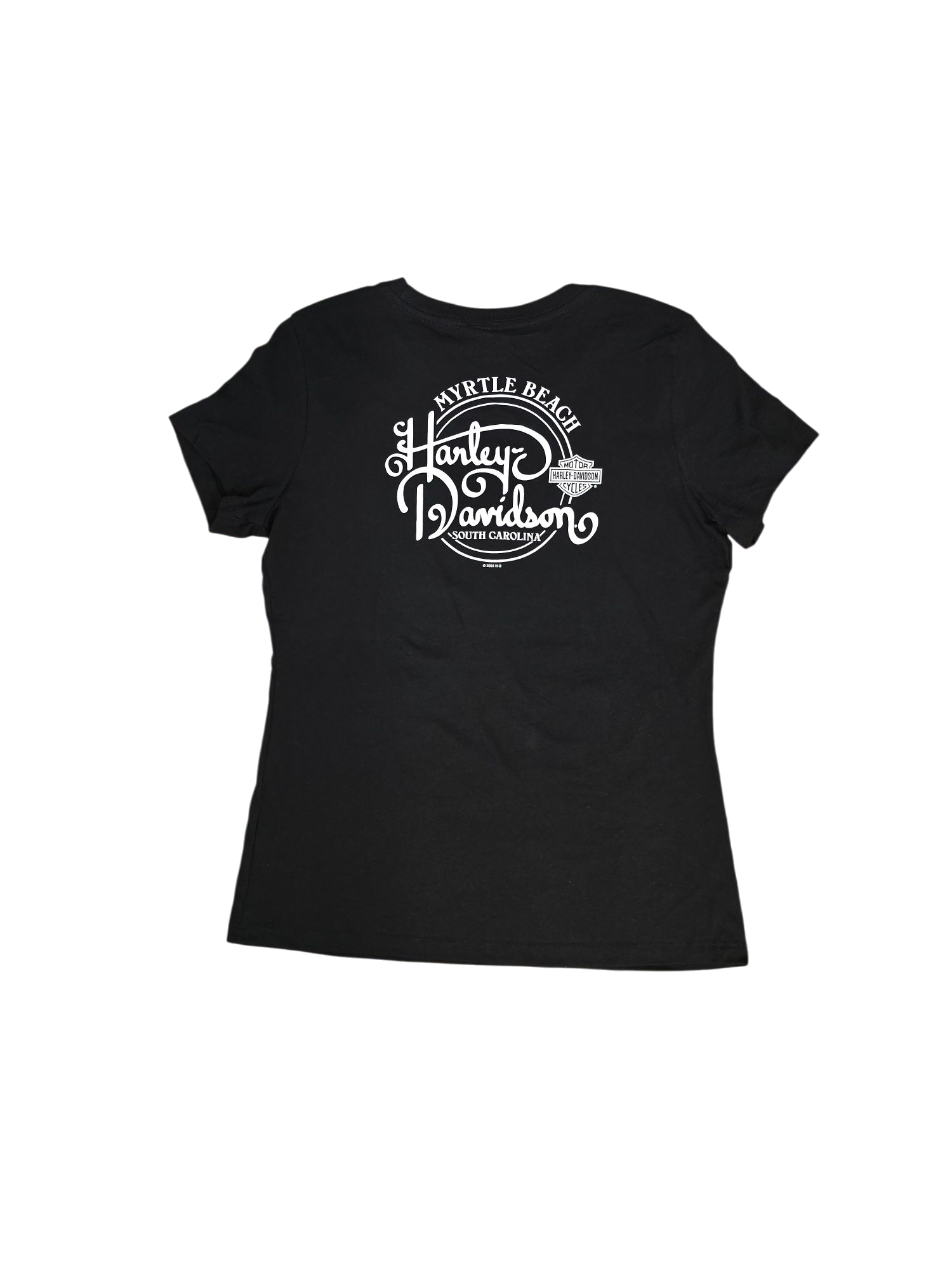 This Collectible Women's Tee with Myrtle Beach Harley-Davidson Logo on the back features Harley-Davidson on the front.