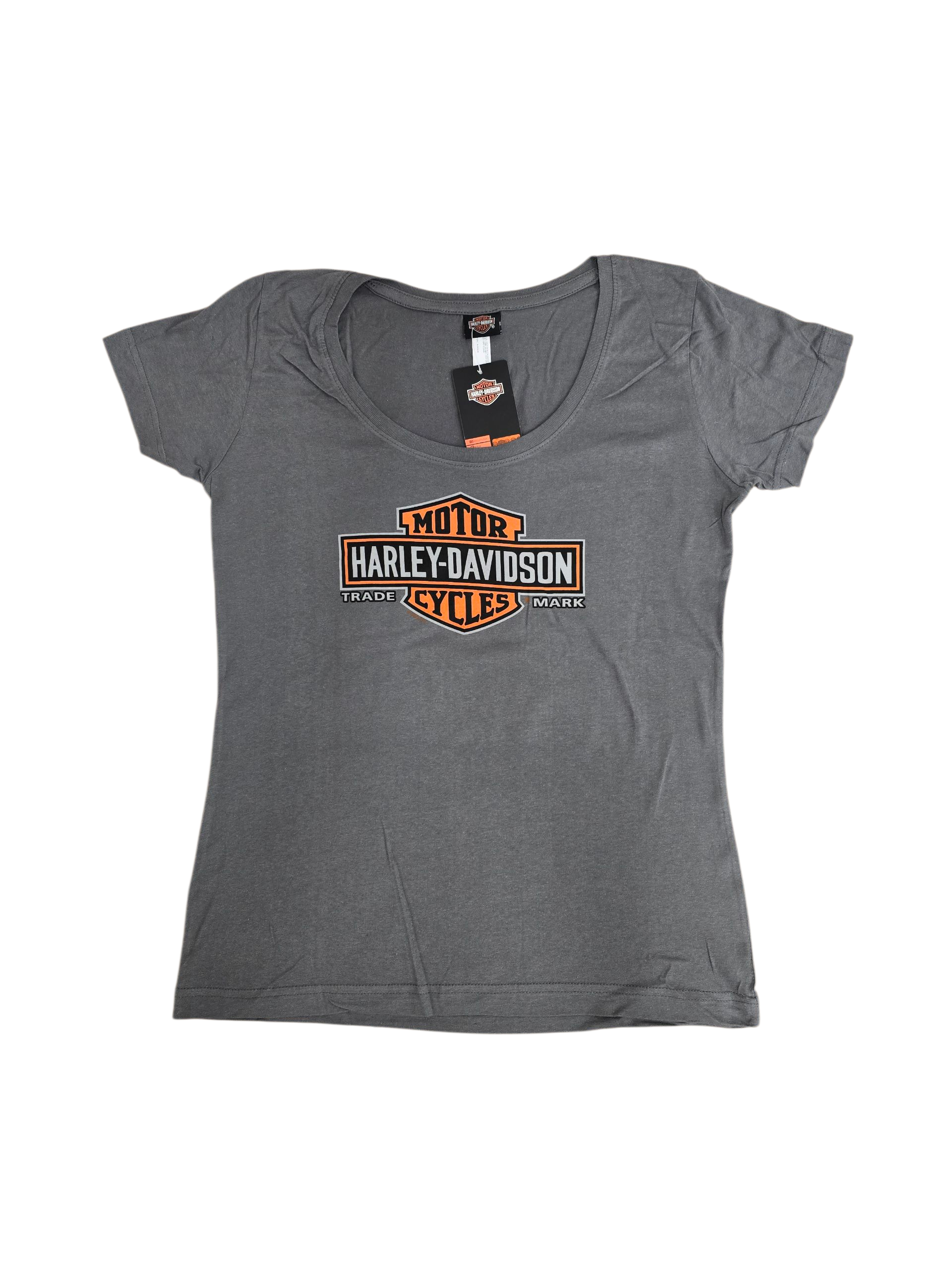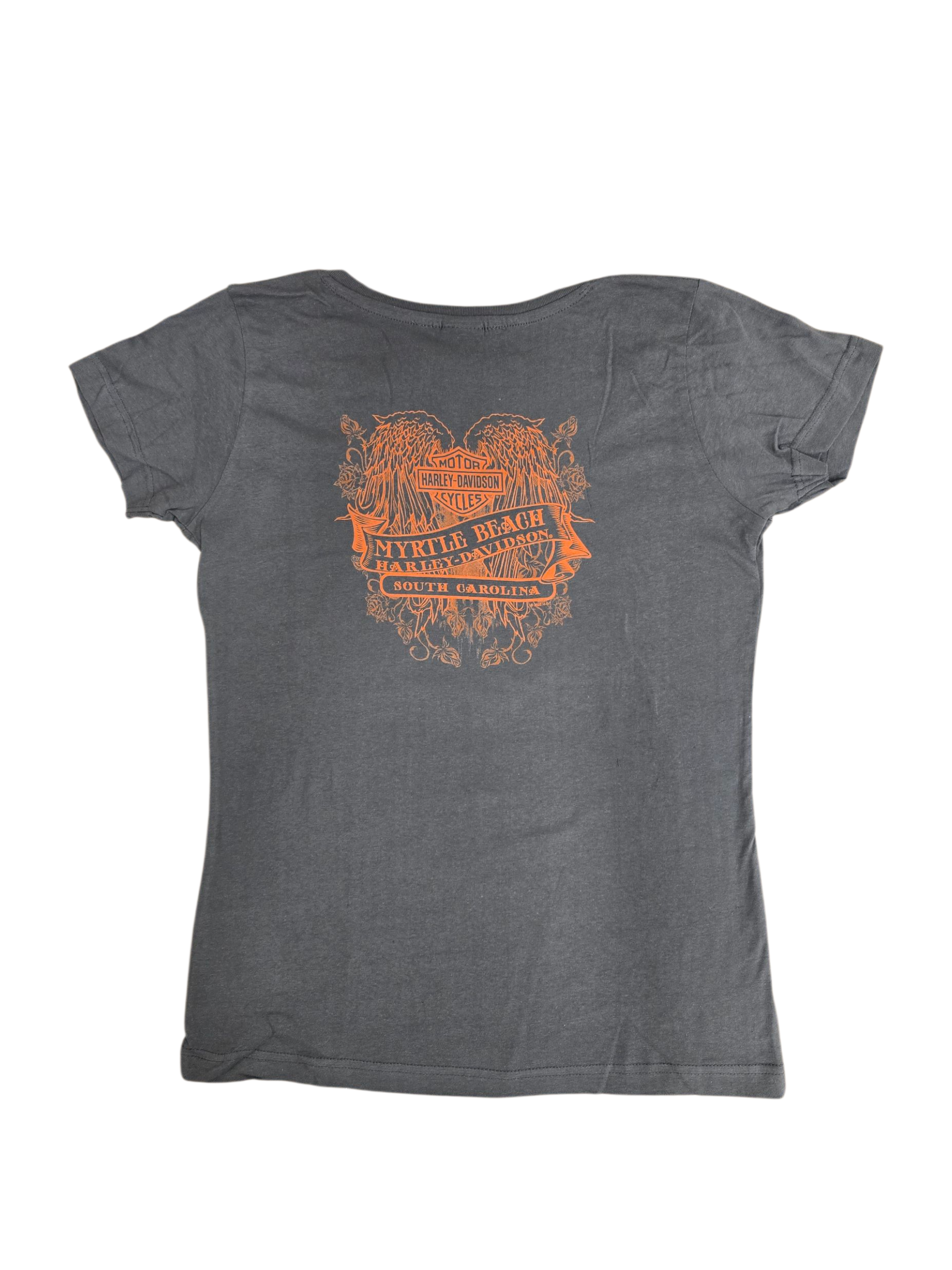 This Collectible Women's Tee with Myrtle Beach Harley-Davidson Logo on the back features Harley-Davidson on the front.