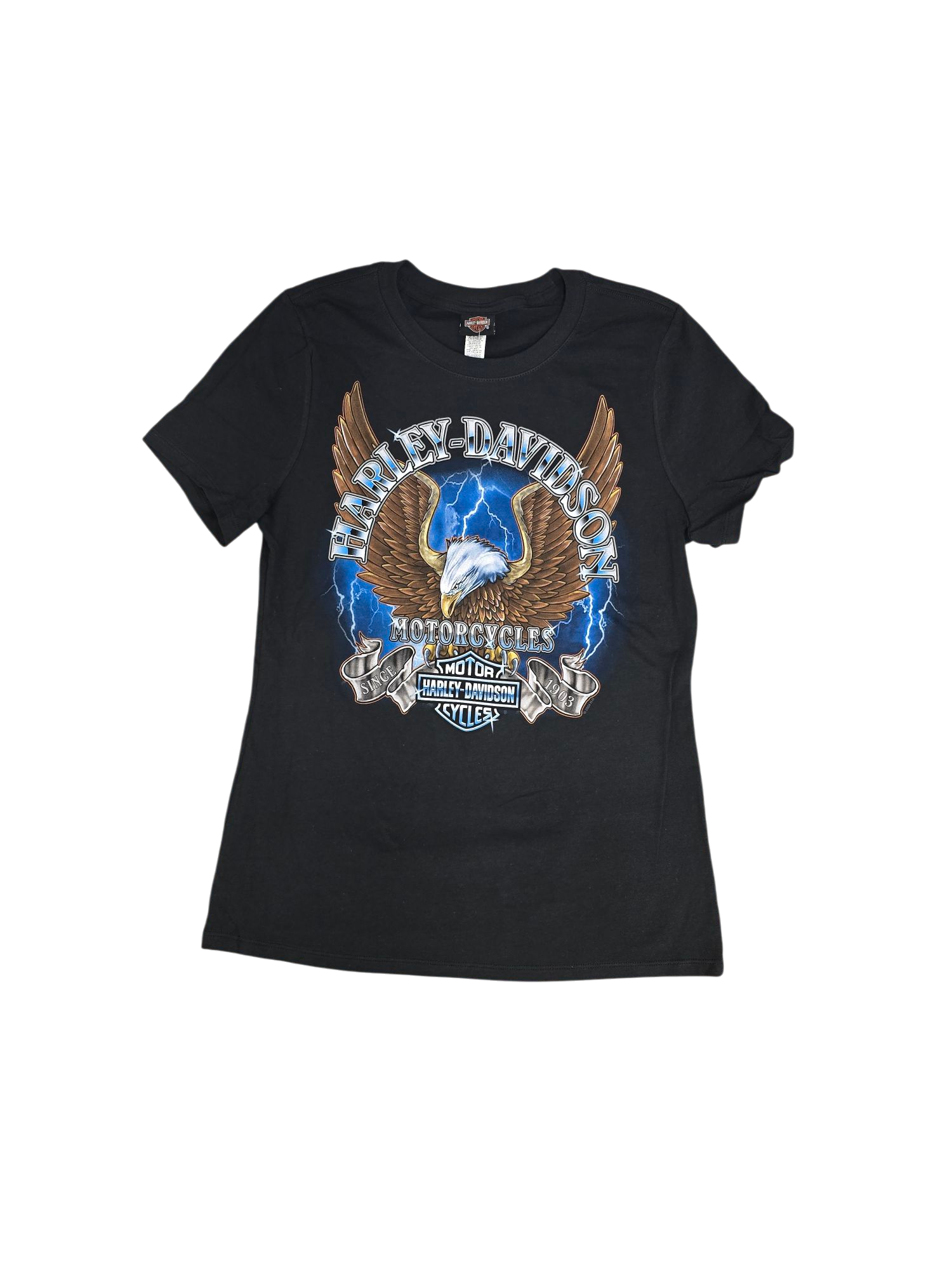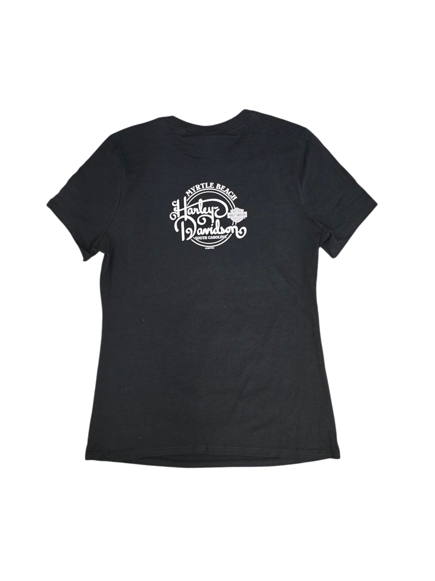 This Collectible Women's Tee with Myrtle Beach Harley-Davidson Logo on the back features Harley-Davidson on the front.
