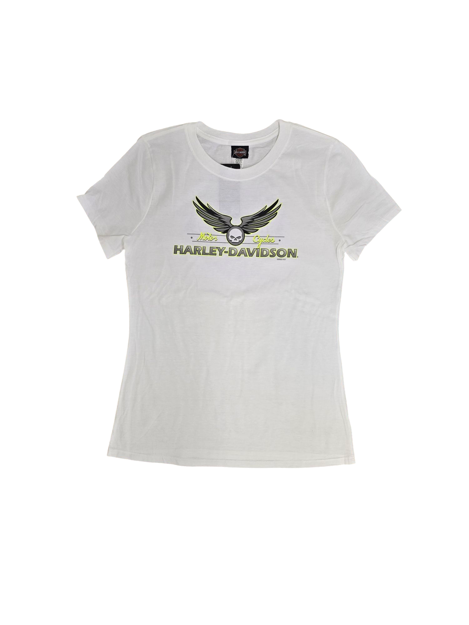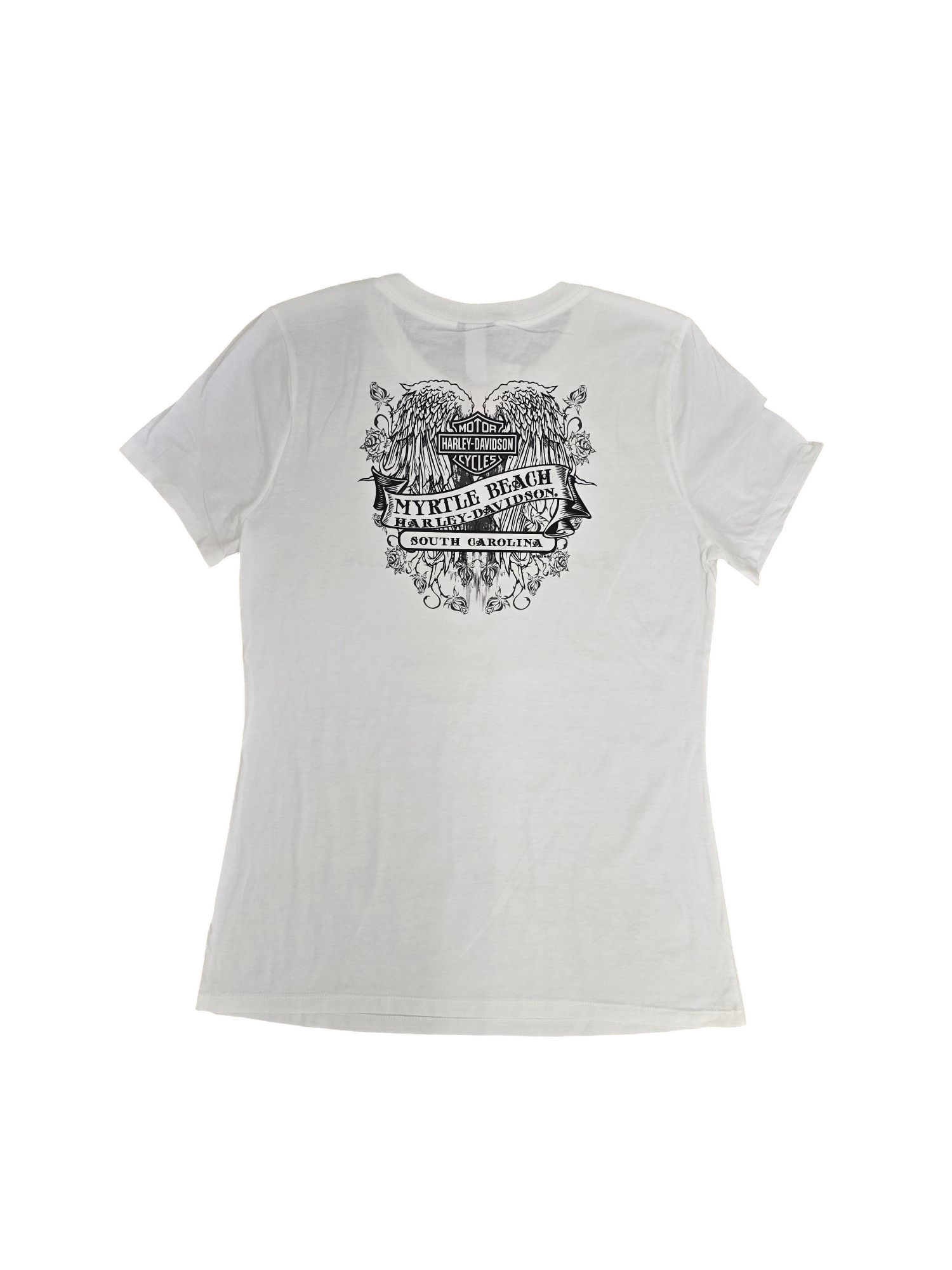 This Collectible Women's Tee with Myrtle Beach Harley-Davidson Logo on the back features Harley-Davidson on the front.