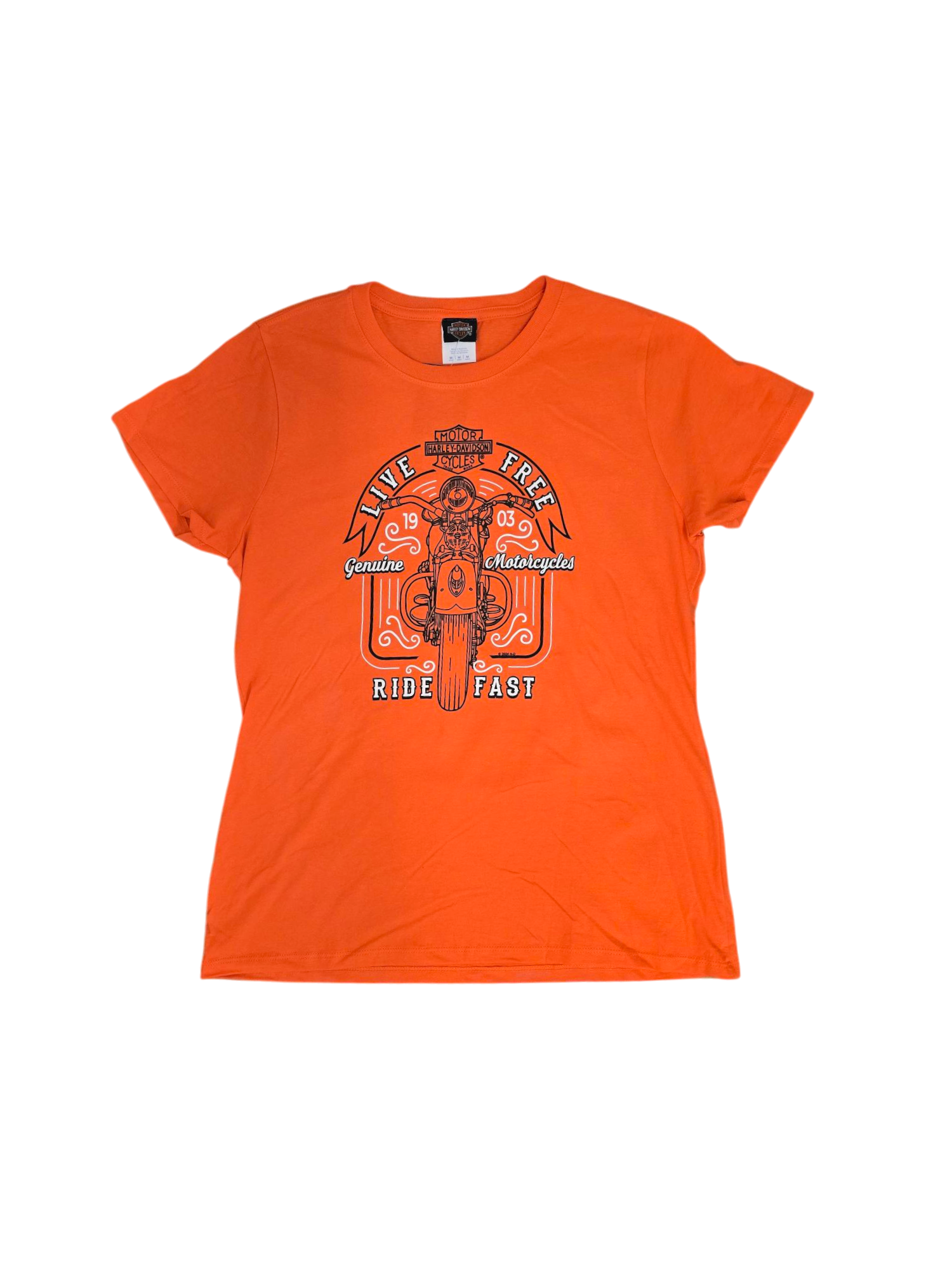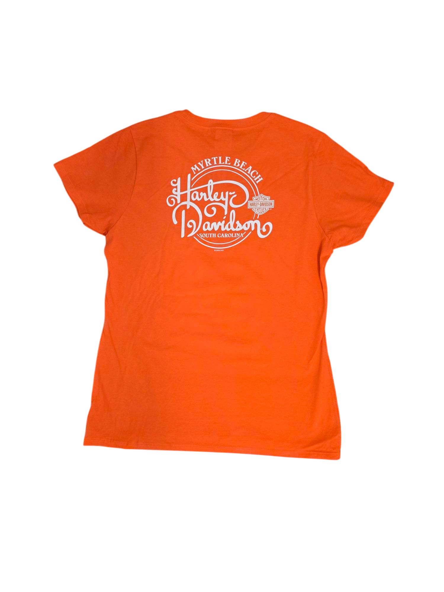 This Collectible Women's Tee with Myrtle Beach Harley-Davidson Logo on the back features Harley-Davidson on the front.