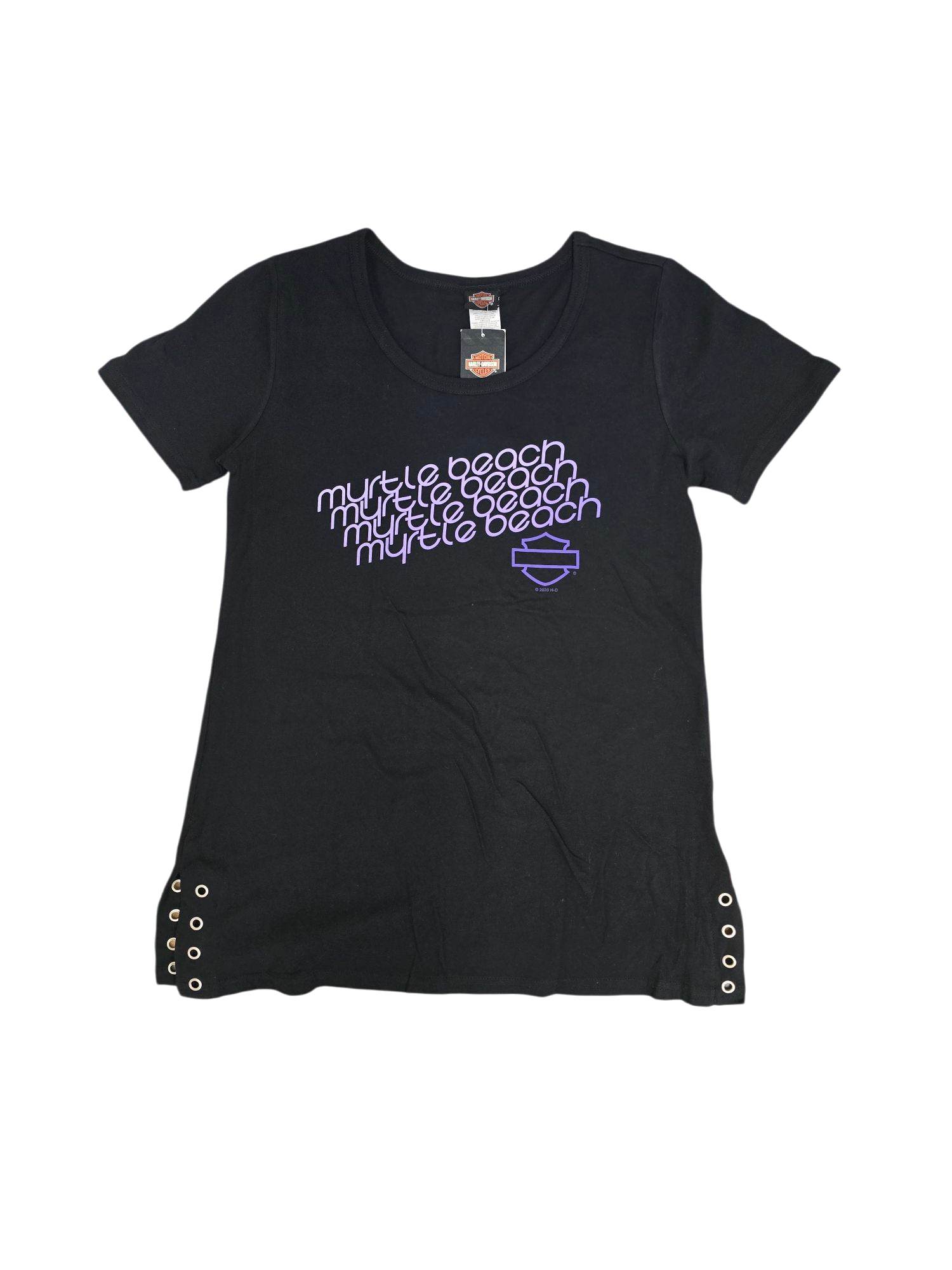 This Collectible Women's Tee with Myrtle Beach Harley-Davidson Logo on the back features Harley-Davidson on the front.