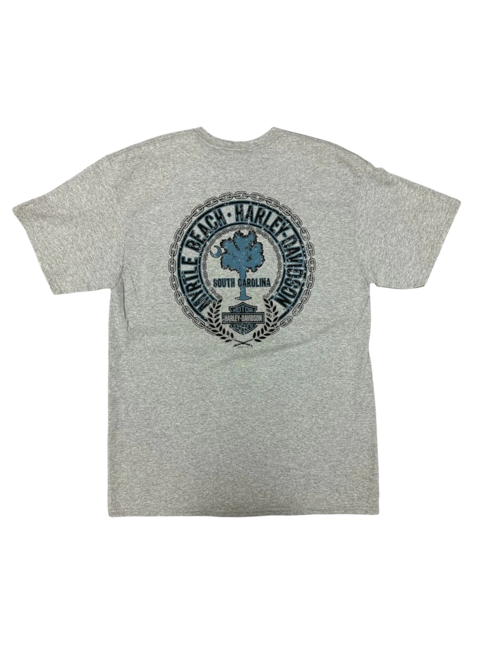 This Collectible Men's Pocket Tee features Myrtle Beach Harley-Davidson Logo on the back has Harley-Davidson on the front